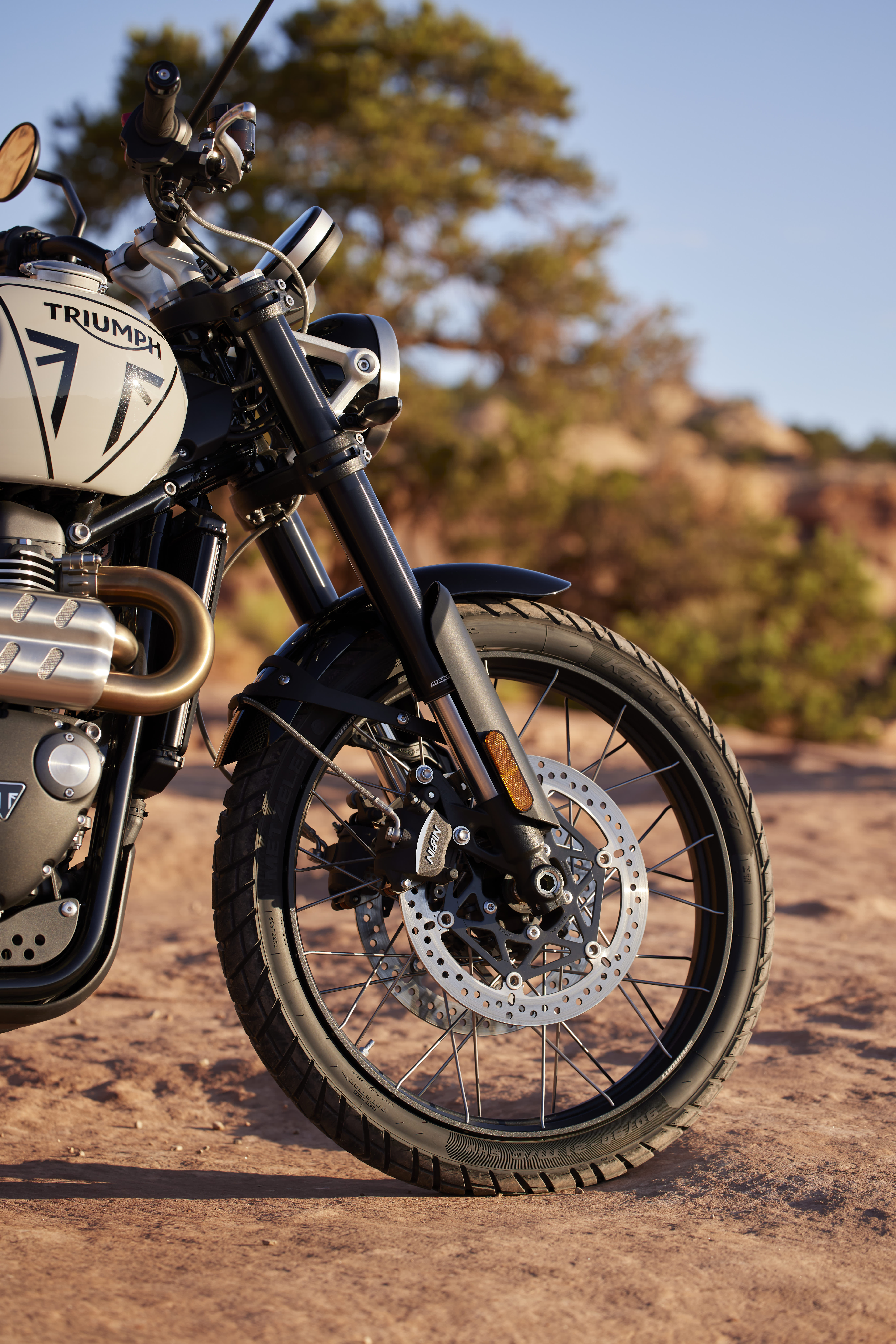 Det store 21" forhjul giver en oprejst og dominerende kørestilling, mens den lave sædehøjde gør Scrambler 1200 X let at håndtere og skaber tillid. Den er klar til både asfalt og grus.