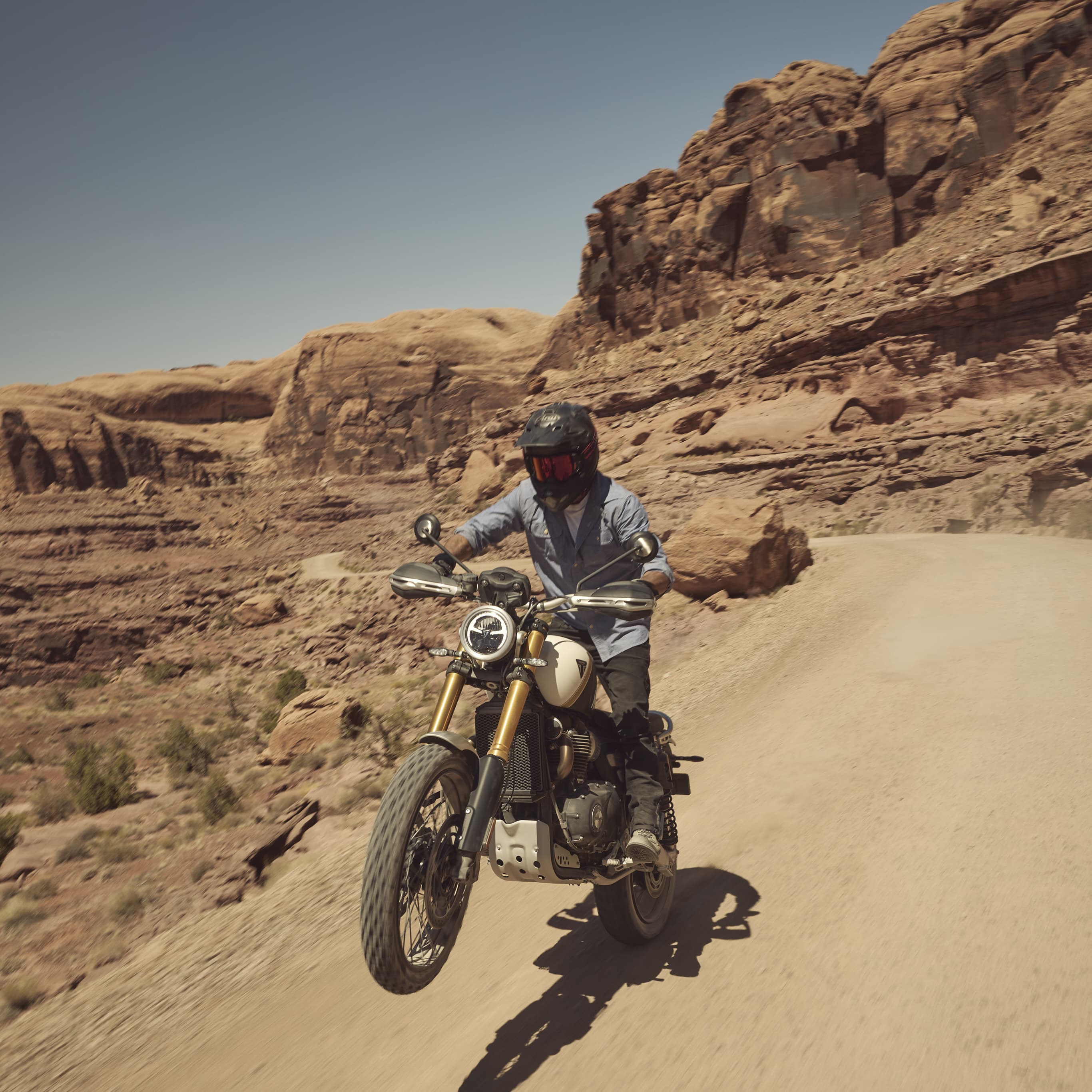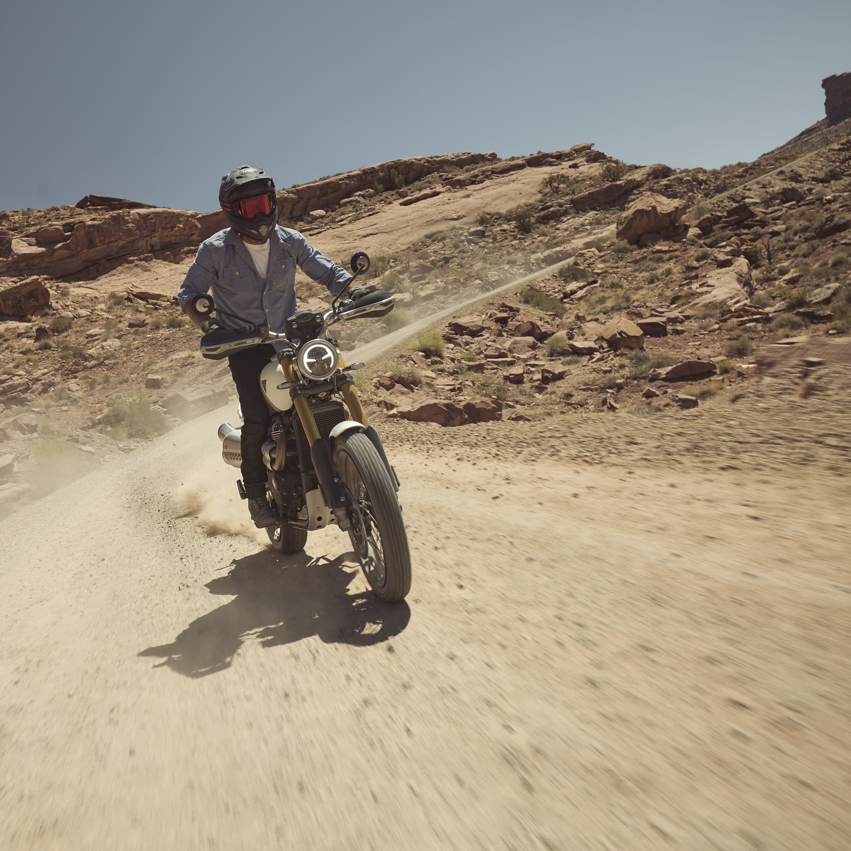 Den 1200cc High Power Bonneville-motor med Scrambler-specifik opsætning giver momentstærkt træk og smidig, let kontrollerbar ydelse – perfekt til både asfalt og grus.