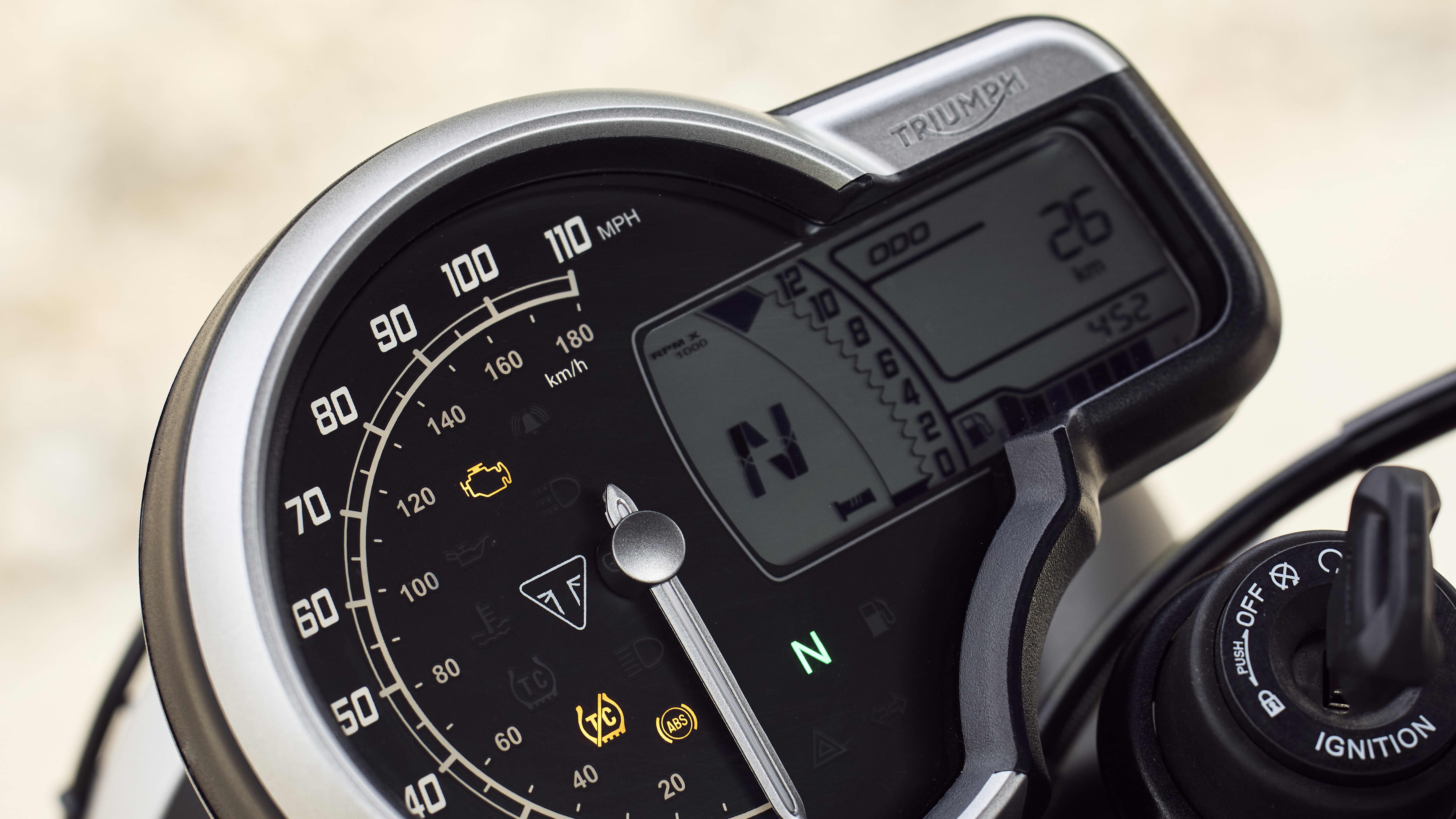 Klassisk speedometer kombineret med moderne LCD-display med tydelig gearindikator og vigtig køreinformation. Traktionskontrol kan slås fra og øger både sikkerhed og offroad-evner.