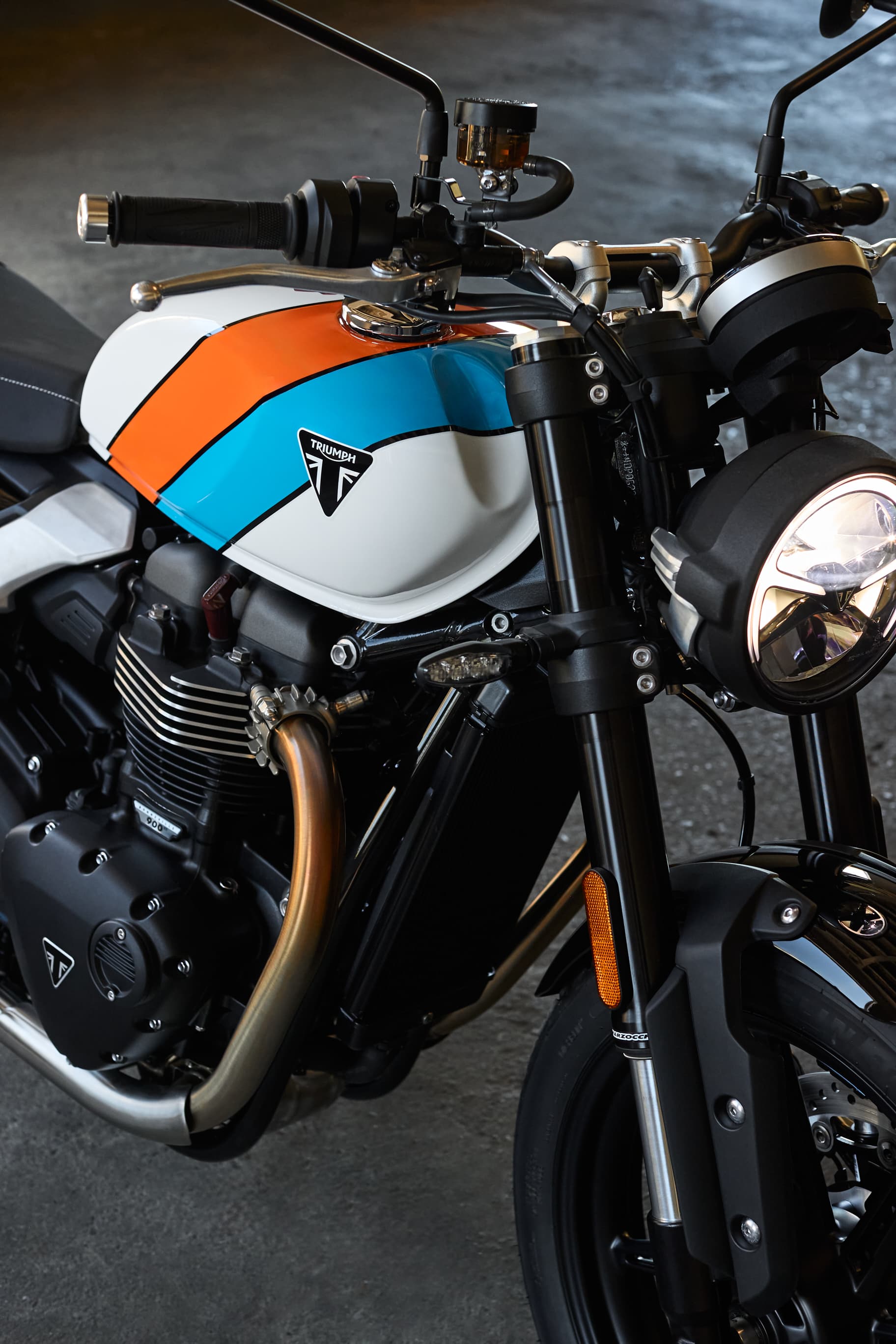 Den nye Speed Twin 900 kombinerer klassisk britisk stil med moderne minimalisme og fås i tre markante, nutidige farver, der vækker opsigt. Den skulpturede tank og skarpt formede sidedæksler skaber et slankt og fokuseret udtryk, fuldendt af detaljer som et børstet aluminiumslåg med flip-funktion og dæksler på gasreguleringen. Enkeltstående skærme og en smal bagramme giver et moderne look, mens elementer med retro-inspiration – som bearbejdede køleribber – skaber kontrast til de sortlakerede motordæksler og forener klassisk og nutidigt.